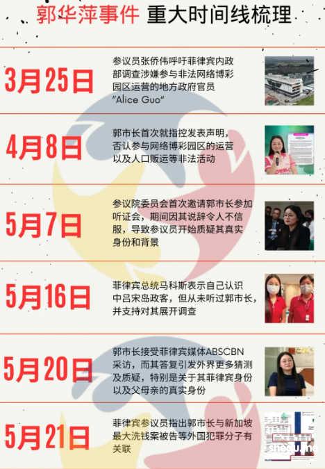 郭市长目前还面临司法部针对突袭网络博彩中心的人口贩运投诉。菲国家调查局(NBI)此前证实郭爱丽(Alice Guo)和中国护照持有者郭华萍有相同的指纹。