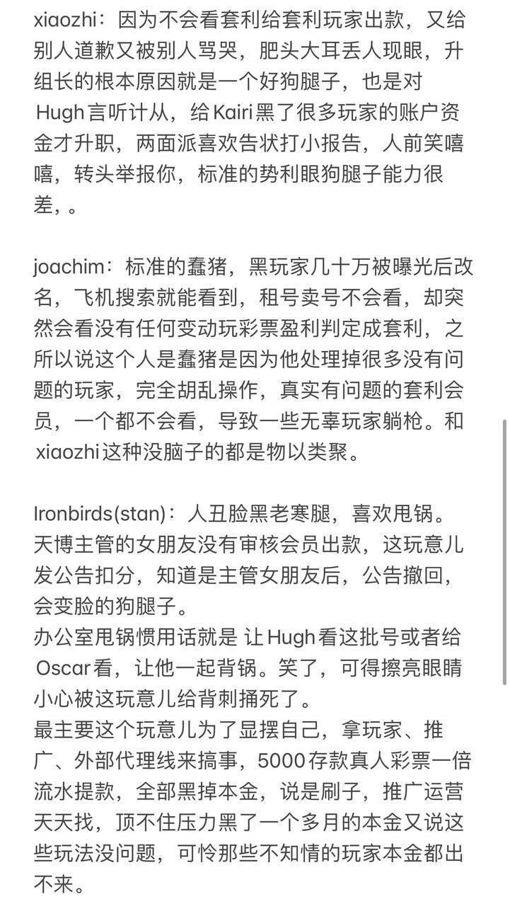 亚博旗下的开云等平台风控部门管理混乱,内部充斥着利益交换和贪污腐败现象。部门管理者利用玩家的本金和盈利作为垫脚石,以此填充自己的业绩,铺设升职的道路,甚至通过这些不义之财来中饱私囊,或与外部势力进行套利合作,支付保护费。