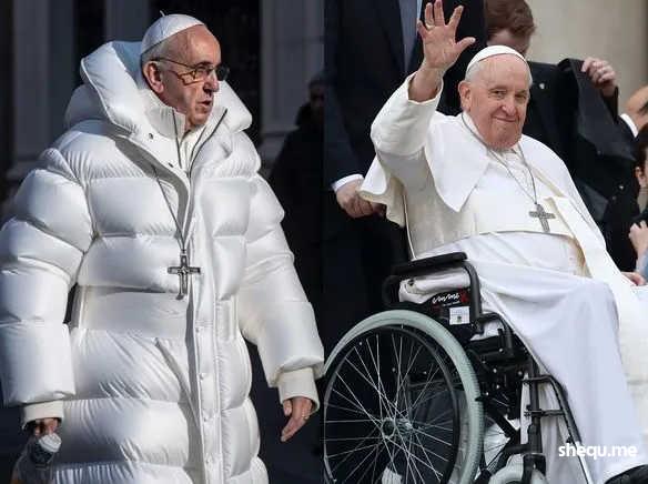 于是,我们会在许多恶搞短视频里看到类似的画面。比如,教皇方济各穿着一件巨大的白色羽绒服?
