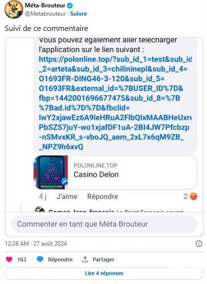 “如果你看到这个视频,说明我已经死了……我决定将留下的一部分遗产赠送给所有法国人民,每个人都能够通过我创建的在线赌场赢得4000欧元。我希望我的女儿已经启动了这个应用程序……您所要做的就是为您的账户充值作为押金,我会在视频下方留下该应用程序的链接。”