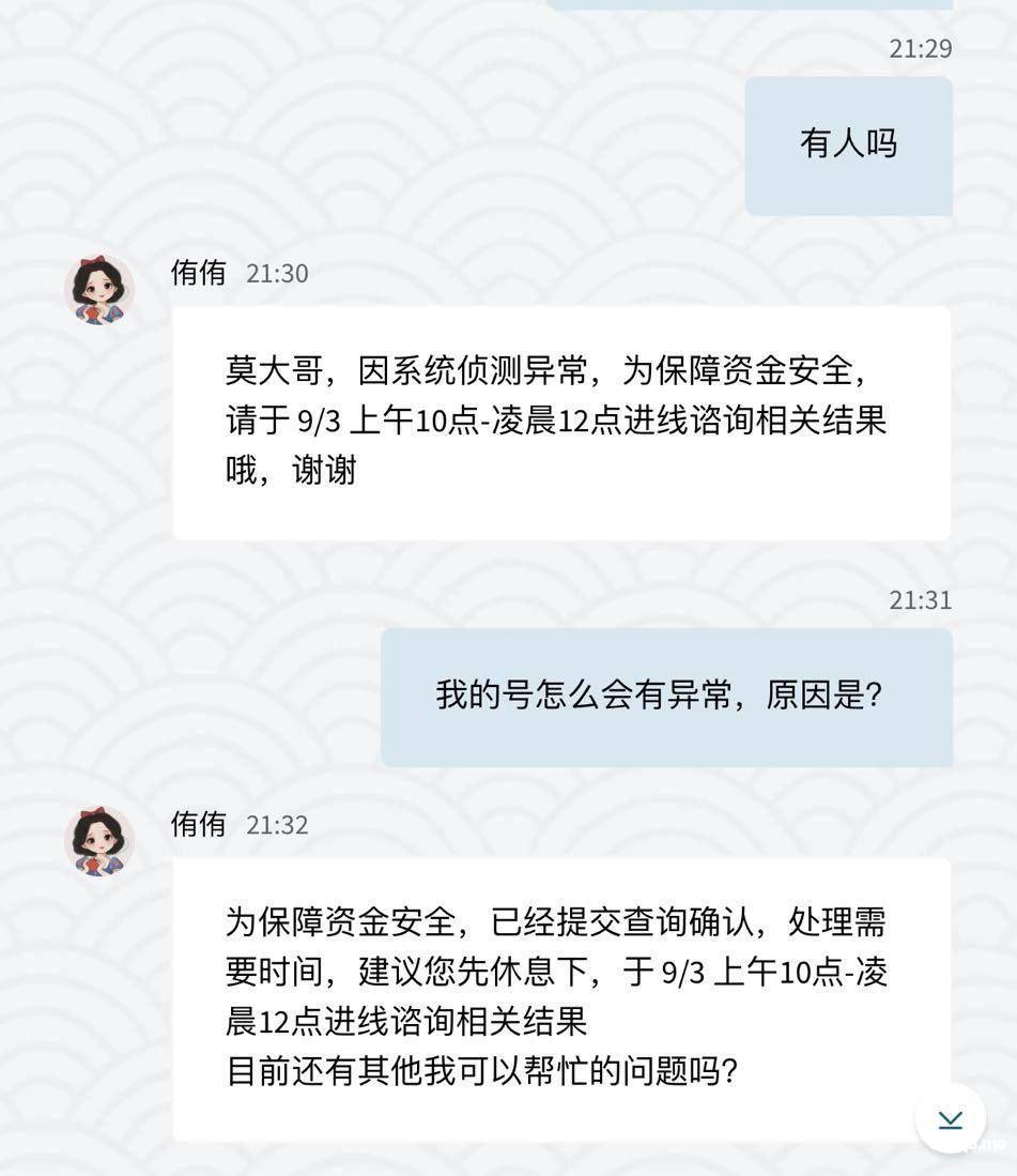 我抱着试试的心态 充值了1000元 1000元我觉得很少 就玩玩电子游戏算了 谁知道赢了23000块 在提款的时候 直接冻结了我的账户 不给我出款 我问客服 他说是我注单有问题 让我4天后咨询客服 我就等到9月3号又咨询了客服 9月3号又咨询客服 说等10号 这个平台妈的一点格局都没有 1000元人名币都黑 妈的 还不够我嫖娼呢 大家避雷。